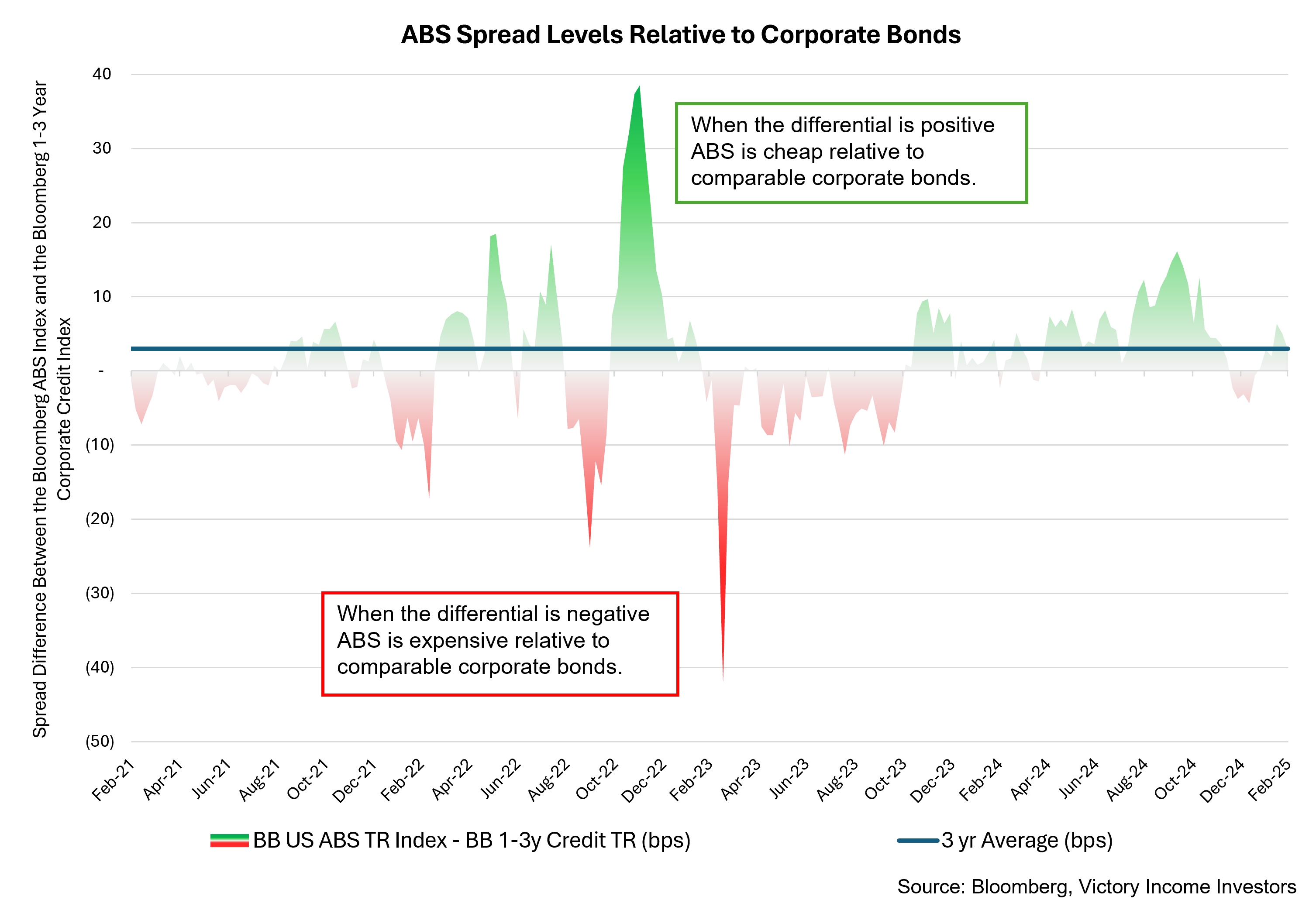 Victory Income Investors likes ABS right now because it offers compelling value relative to corporate credit, in our opinion. This is evident in the credit spread, which is the yield difference between different types of fixed income securities with similar maturities. The graph below compares investment-grade corporate bonds to highly rated Consumer ABS and illustrates the point.