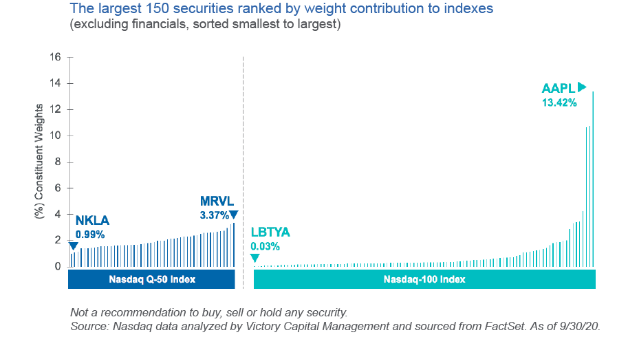 The chart above illustrates the point by depicting the 150 largest non-financial securities, ranked by market cap, listed on the Nasdaq Exchange. The largest 100 of these are in the Nasdaq-100® Index, and the next 50 largest are in the Nasdaq-Q50® Index. Both share an identical cap-weighting methodology and aim to offer exposure to some of the finest—and most disruptive—companies trading on the Nasdaq Exchange.