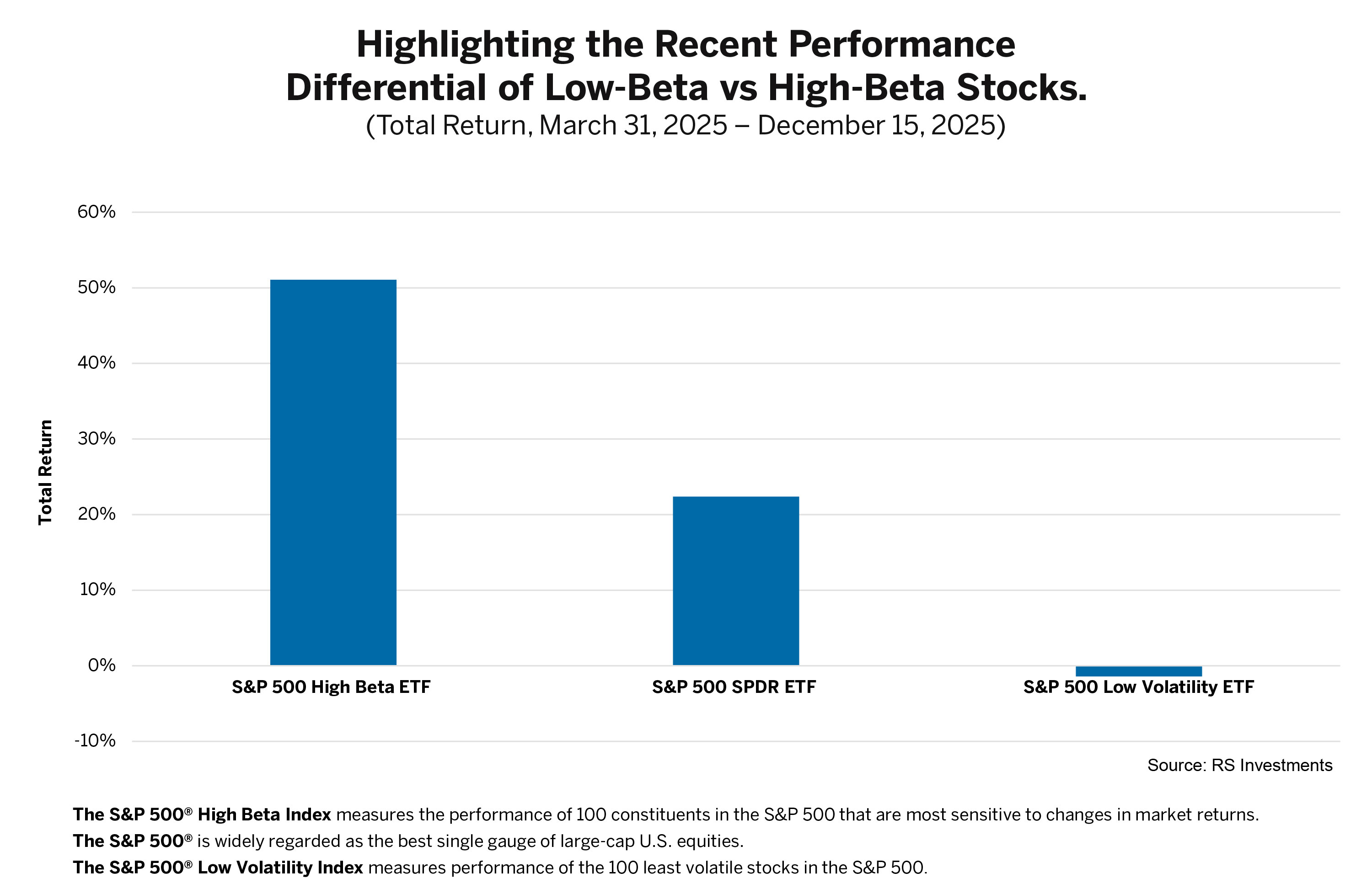 In today’s equity market, our collective fascination with AI has created an unusual backdrop whereby high-beta stocks—loosely defined as those that are more volatile than the overall market—have been significantly outperforming the broader market and low-beta stocks. This dynamic has occurred in the past, often in strong bull markets, in anticipation of lower interest rates, or in other periods where investors become enamored by story-stocks and their potential. However, it has recently grown to extremes, as illustrated in the below graph.